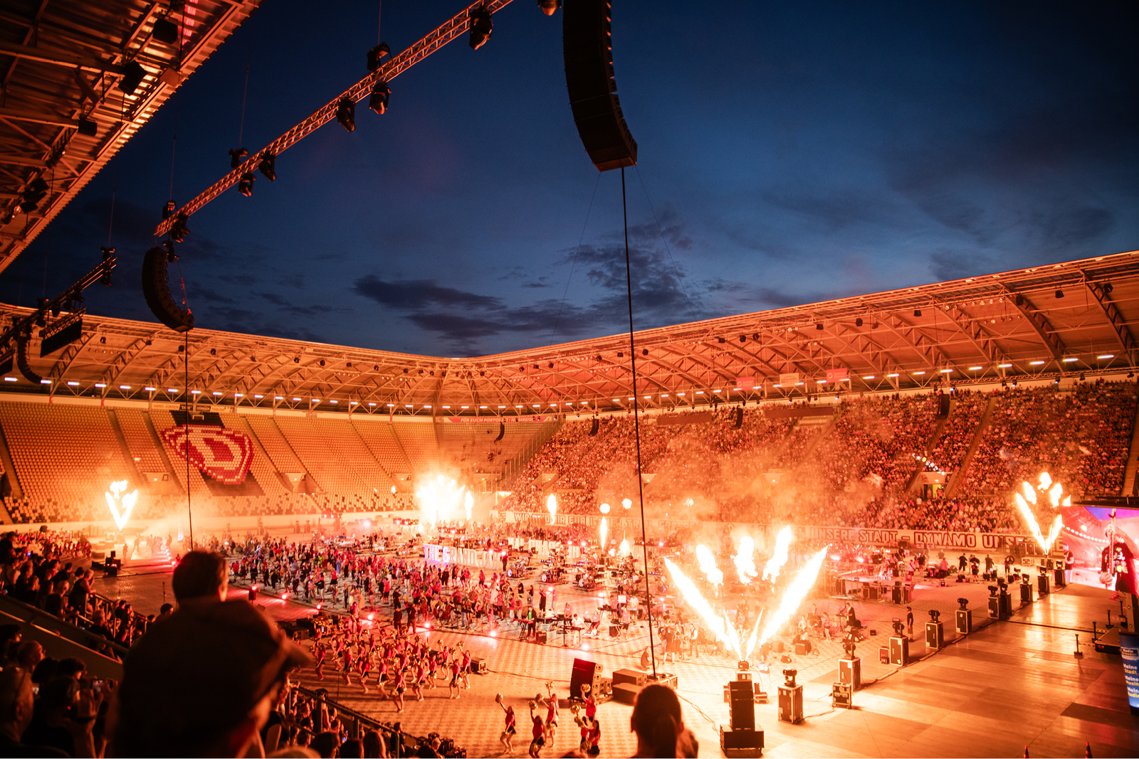 Dresden, Germany - More than 1,000 musicians performed before 15,000 fans at Rudolf-Harbig-Stadion, in what organizers billed as the largest TT+ Audio’s GTX System deployment in Germany to date. The Grand Jam 2025 united all musicians across two stages, positioned on the west and main grandstands, to form a single, immense orchestra that captivated and moved the audience.